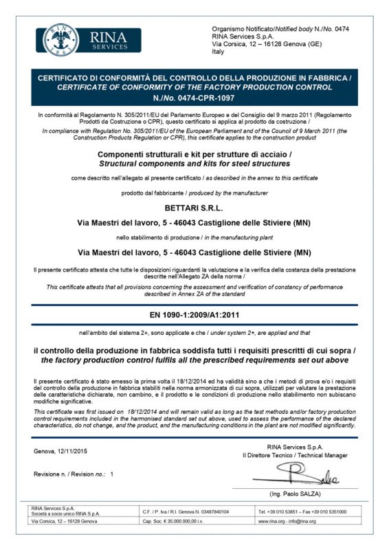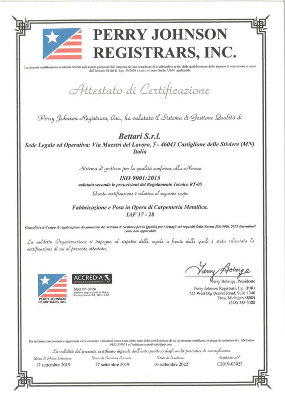Oggi la Bettari srl ha sede nella zona industriale di Castiglione delle Stiviere, in una nuova struttura di 12.000 mq. Di cui 4.000 coperti, e opera sia nell’ambito civile che in quello industriale, affiancando la clientela dalla fase di progettazione, seguita dallo studio tecnico interno, fino all’assistenza post-vendita.