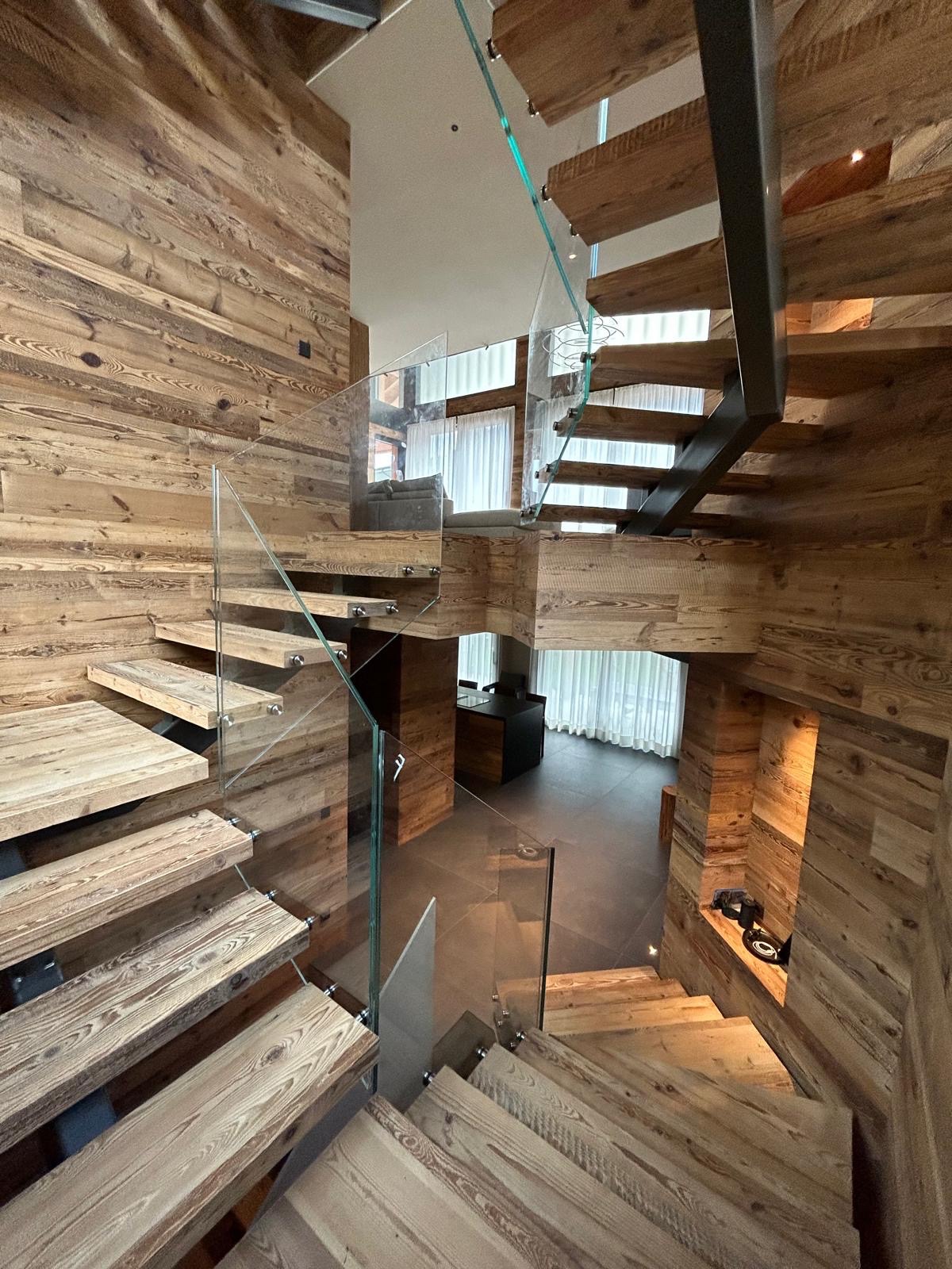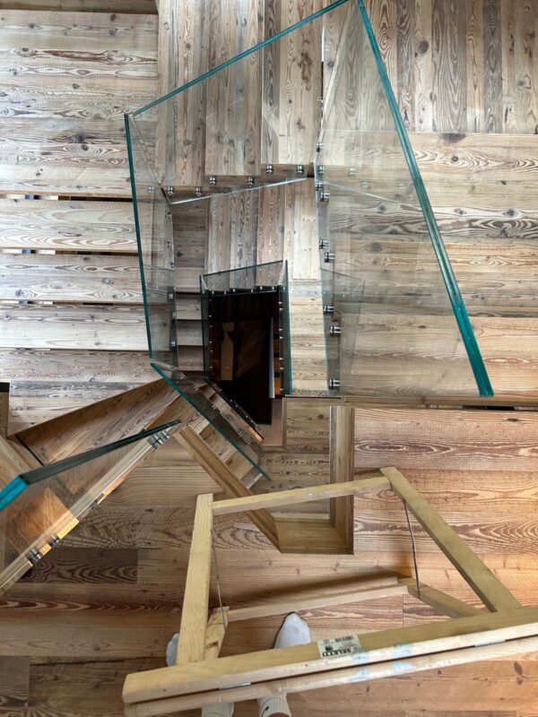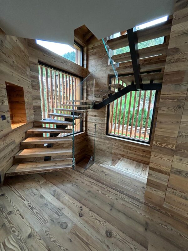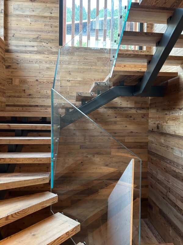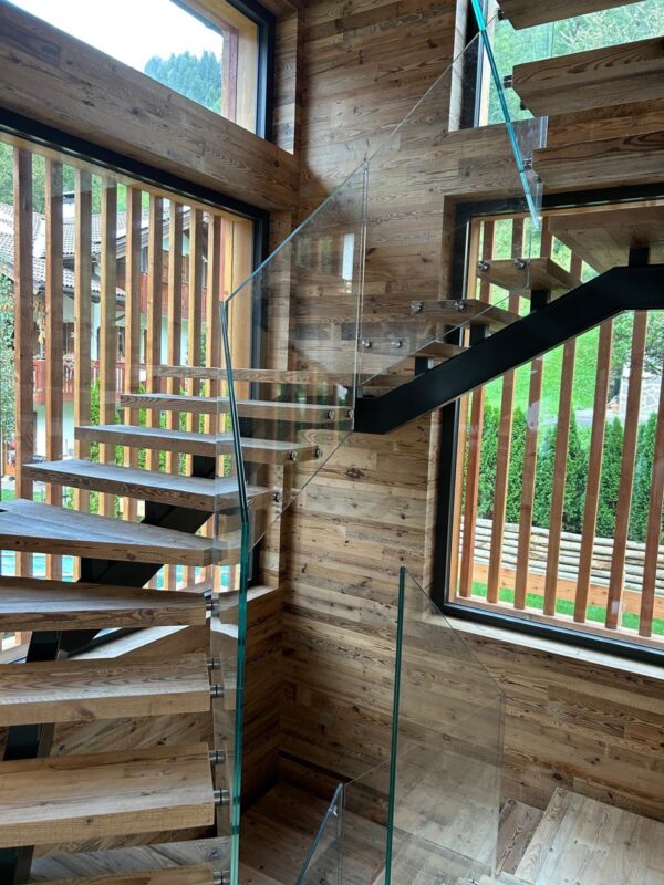 Progettazione e realizzazione di una scala a tre rampe per un’abitazione privata, con struttura portante in tubolare e gradini rivestiti in legno. Finitura con verniciatura a polvere.